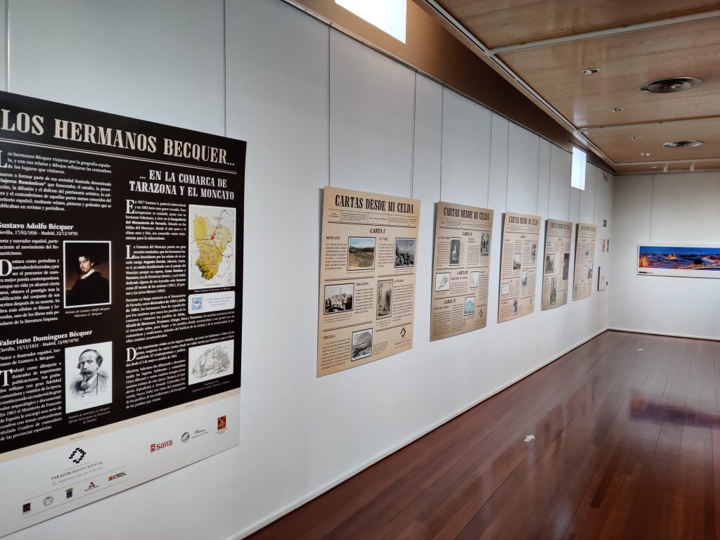 Las fotografías sobre el Patrimonio Cultural y Natural de Tarazona se complementan con 6 paneles en gran formato que introducir la estancia de los Bécquer en nuestra Comarca y resumen las 9 cartas Desde mi Celda en las que Gustavo Adolfo Bécquer relató a toda España, a través del periódico madrileño El Contemporáneo, sus viajes y encuentros en los diferentes pueblos del Moncayo y la impresión que causa en él la pintoresca ciudad de Tarazona a la que bautizaría como “la pequeña Toledo”. Así mismo, en ellos encontramos una selección de los dibujos de su hermano Valeriano, recogidos en 5 álbumes y varios cuadernos entre los que destaca Cuaderno Expedición a Veruela, que mejor ilustran el paisaje, la magia, las costumbres, y los valores culturales y humanos de las personas. Su exquisito trabajo ensalzó nuestro territorio y lo hizo más atractivo si cabe. Esperamos que los visitantes a esta muestra se sientan tan atraídos por nuestra Comarca como se sintieron los hermanos Bécquer.